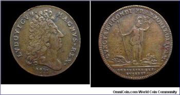 A french counter of Louis XIV of yellow copper, reverse minerva cunctae frondi praeponit olivam
